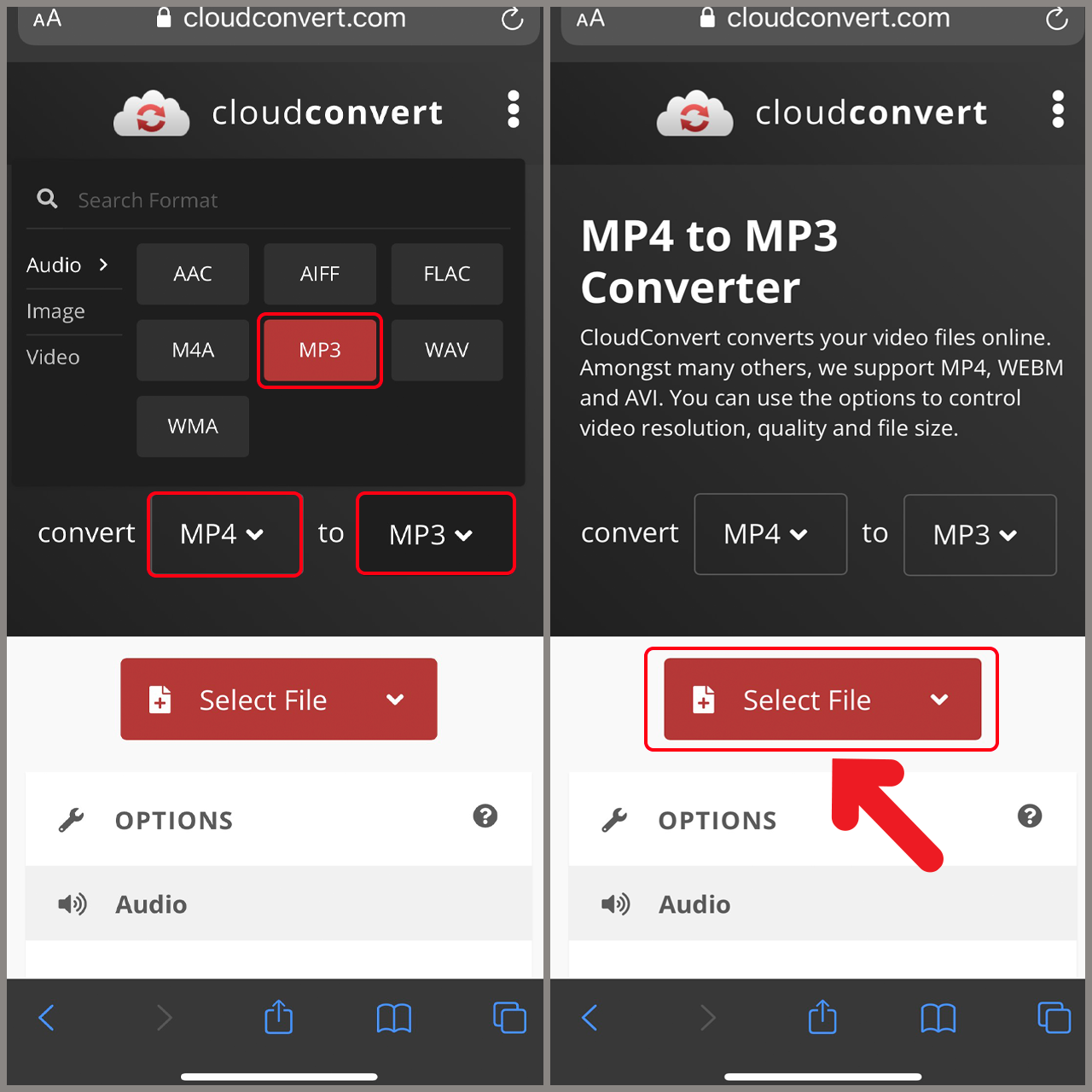 Bước 2: Tiếp theo, bạn sẽ truy cập vào trang web CloudConvert thông qua đường dẫn phía dưới đây. Tại đây, bạn cần lựa chọn định dạng cho file mà bạn mong muốn chuyển đổi. Trong trường hợp này, bạn hãy chọn lựa chọn để chuyển đổi từ MP4 sang MP3. Sau đó, bạn hãy nhấn vào nút Select File để tải video từ TikTok mà bạn muốn chuyển sang định dạng âm thanh lên trang CloudConvert.com.