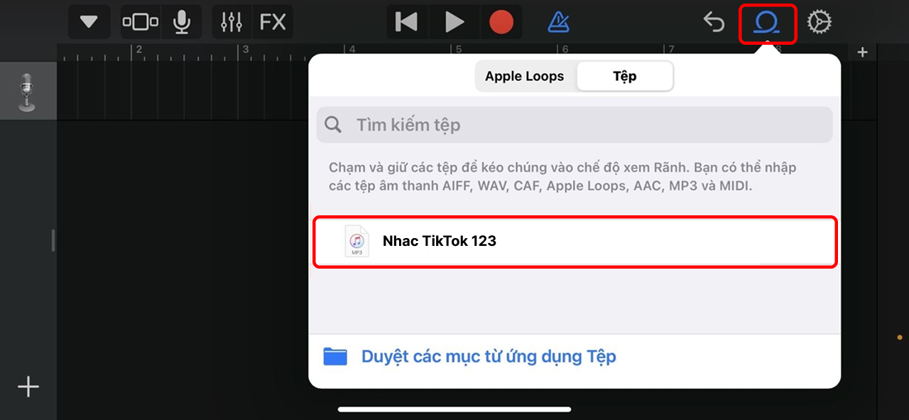 Trong bước này, trước tiên bạn cần tìm và nhấn vào biểu tượng cho phép bạn duyệt qua các thư mục và tệp tin trên thiết bị của mình. Sau khi mở cửa sổ duyệt file, hãy tìm kiếm trong danh sách các tệp đã tải về và chọn âm thanh mà bạn vừa mới lưu lại. Điều này sẽ giúp bạn dễ dàng truy cập và sử dụng âm thanh mà bạn ưa thích.